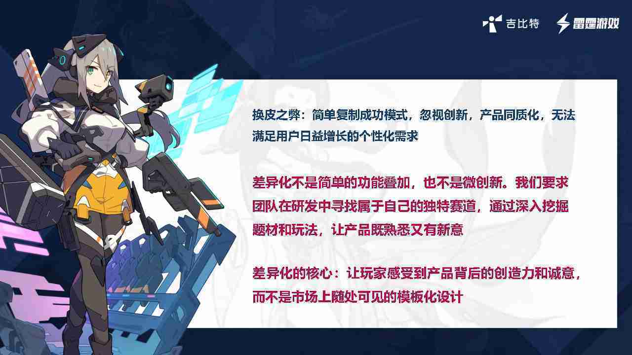 在我們內部是這么定義差異化的。。首先,,,,差異化不是簡單的功能疊加,,更不是換皮。。。。只是換皮,,產品無法提供有效的市場價值。。內部經常說差異化的產品不是為了迎合市場,,,而是找到一個自己獨特的表達方式,,在研發中找到屬于自己的細分賽道和獨特賽道,,,,前提是需要對這個題材有足夠的深入、、、、挖掘,,對玩法有足夠深入的理解,,讓產品看起來既熟悉又有新意。。。